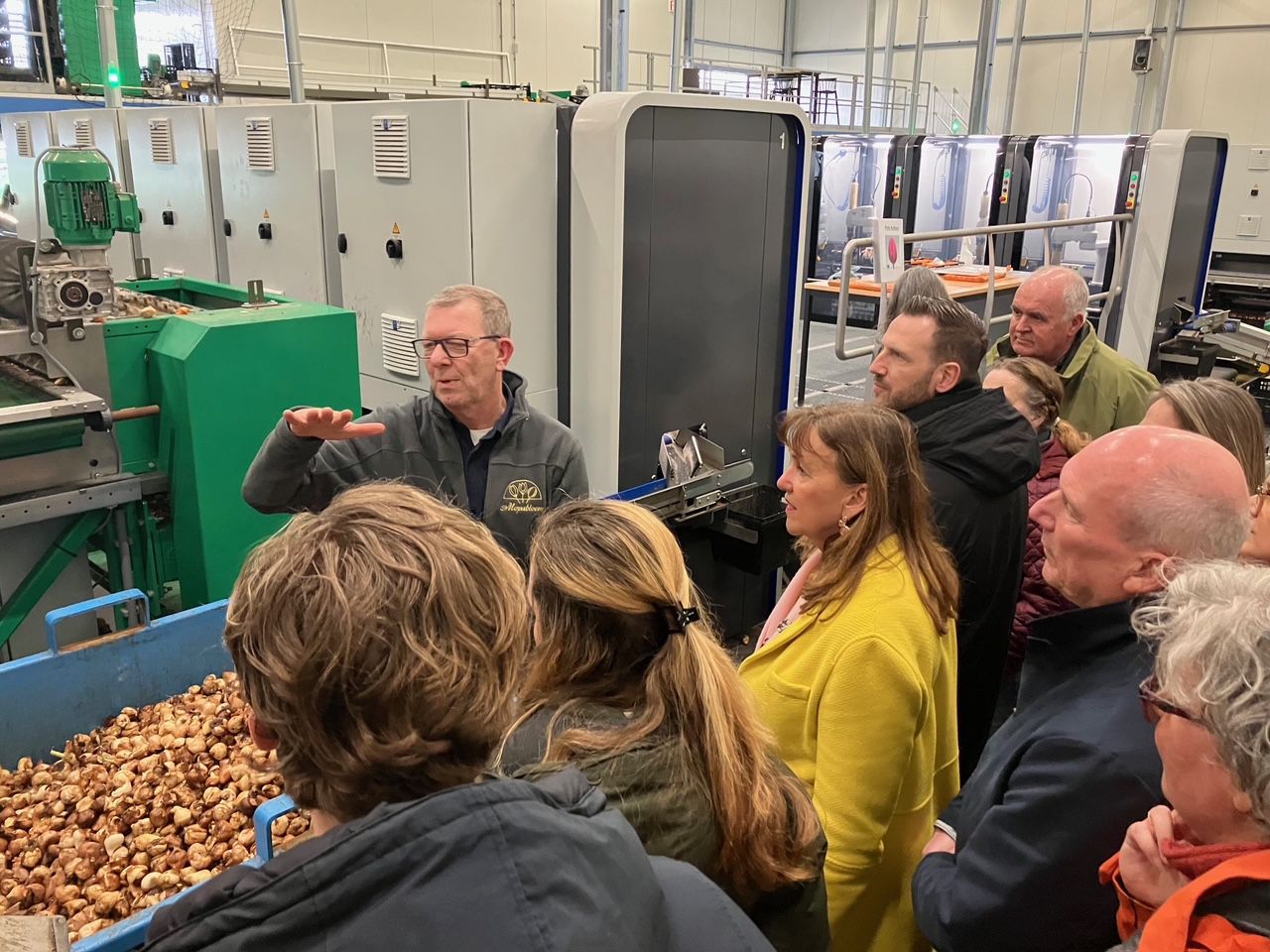 Als afsluiting van de middag kregen de deelnemers een rondleiding bij Zwettulips en Mopabloem. En dat maakte indruk. In de grote hallen staan lange rijen kratten met bollen. Transportbanden lopen door het hele gebouw. Machines sorteren, controleren en verpakken de bloemen in een strak tempo.